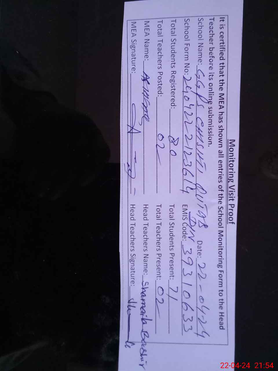 | Attendance Register | Head Teacher | MEA with School | Visit Proof |