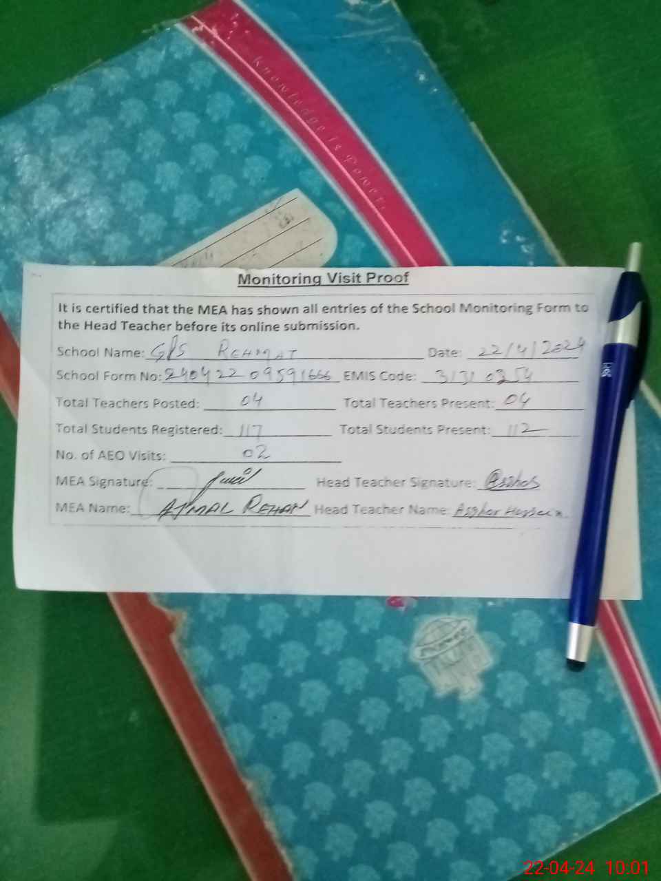 | Attendance Register | Head Teacher | MEA with School | Visit Proof |