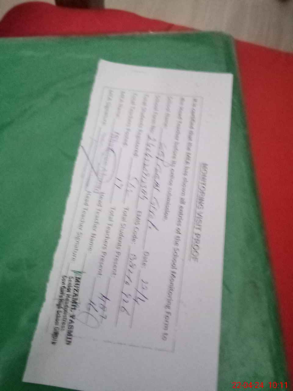 | Attendance Register | Head Teacher | MEA with School | Visit Proof |