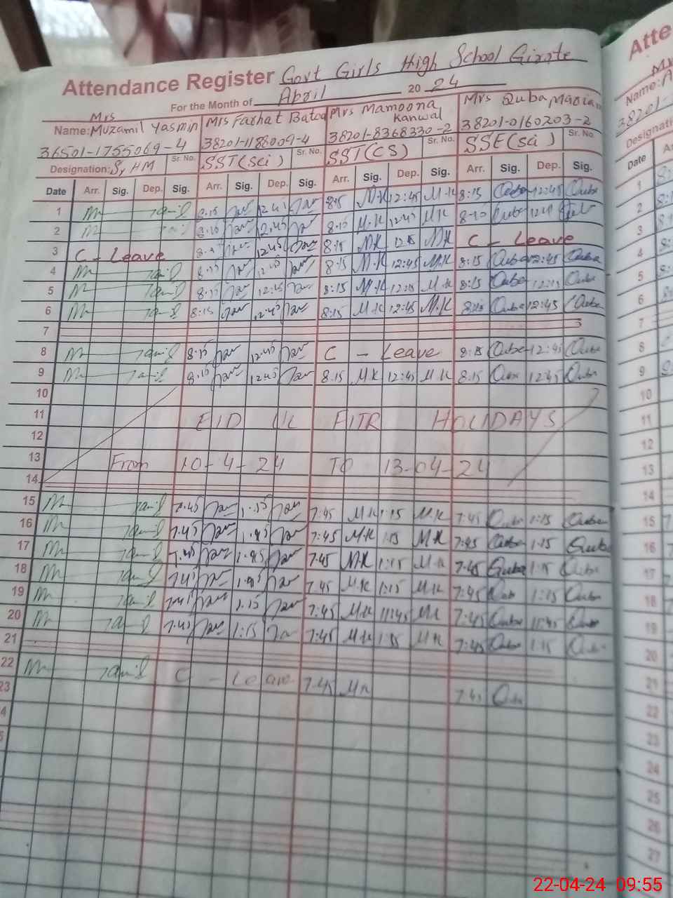 | CNIC | Full Name | Designation | R/C | Absence During Last Calender Month |