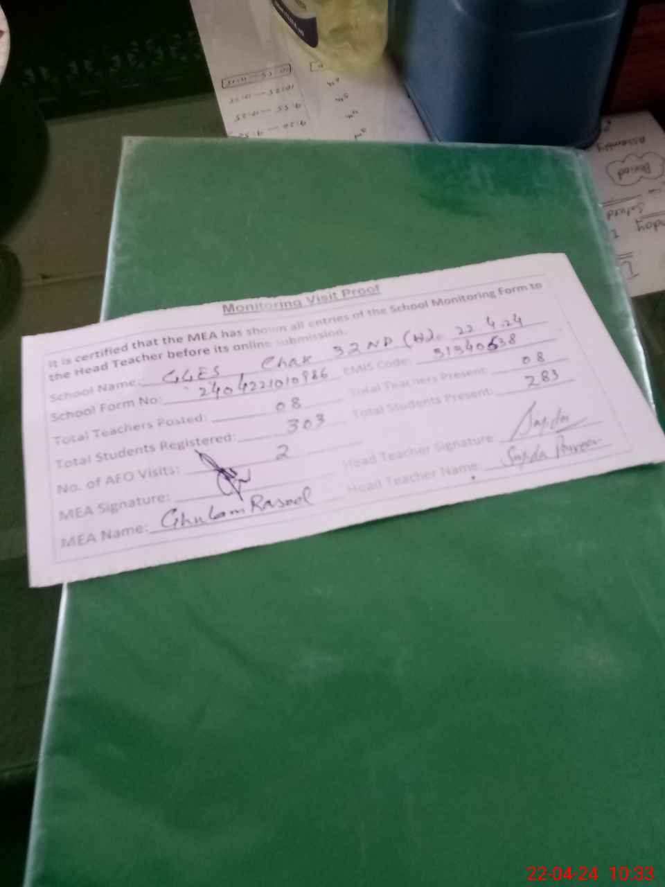 | Attendance Register | Head Teacher | MEA with School | Visit Proof |