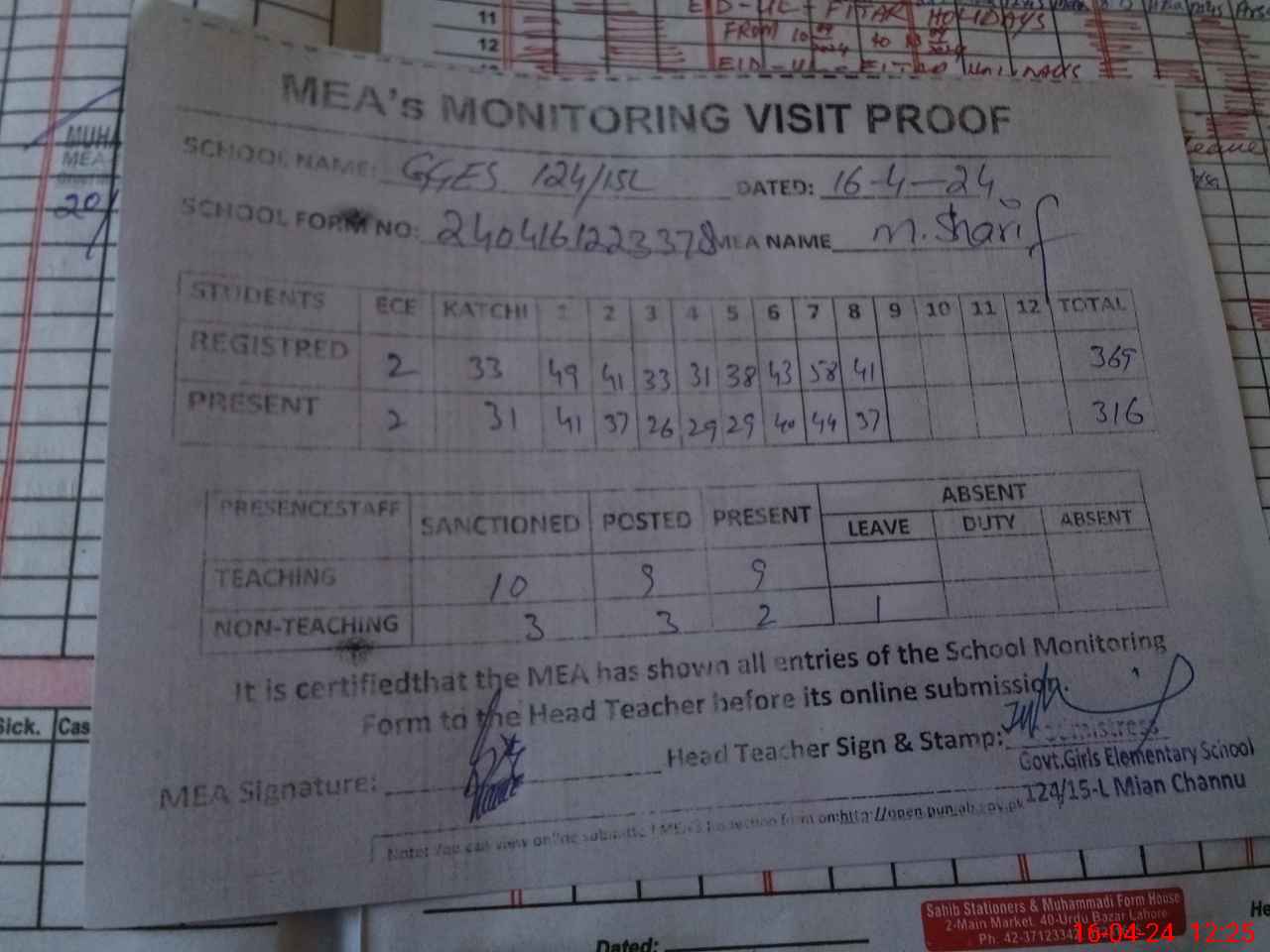 | EMIS Code: 36430081 | Name of School: GGES 124/15-L, MIAN CHANNU | |||