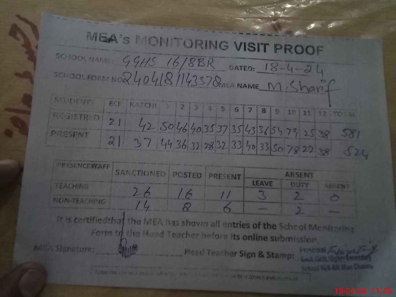 | Attendance Register | Head Teacher | MEA with School | Visit Proof |