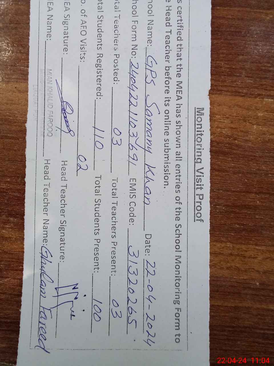 | EMIS Code: 31320265 | Name of School: GPS BASTI SAMNAY KHAN | |||