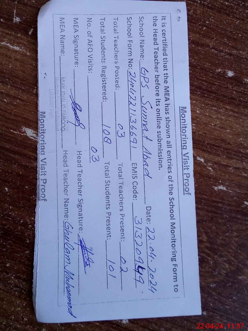 | Attendance Register | Head Teacher | MEA with School | Visit Proof |