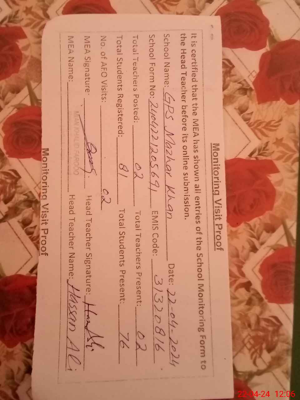 | EMIS Code: 31320816 | Name of School: GPS BASTI MAZHAR KHAN | |||