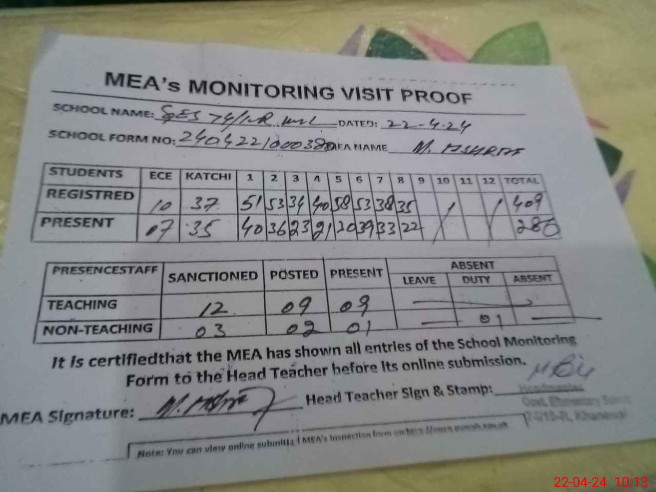 | Attendance Register | Head Teacher | MEA with School | Visit Proof |