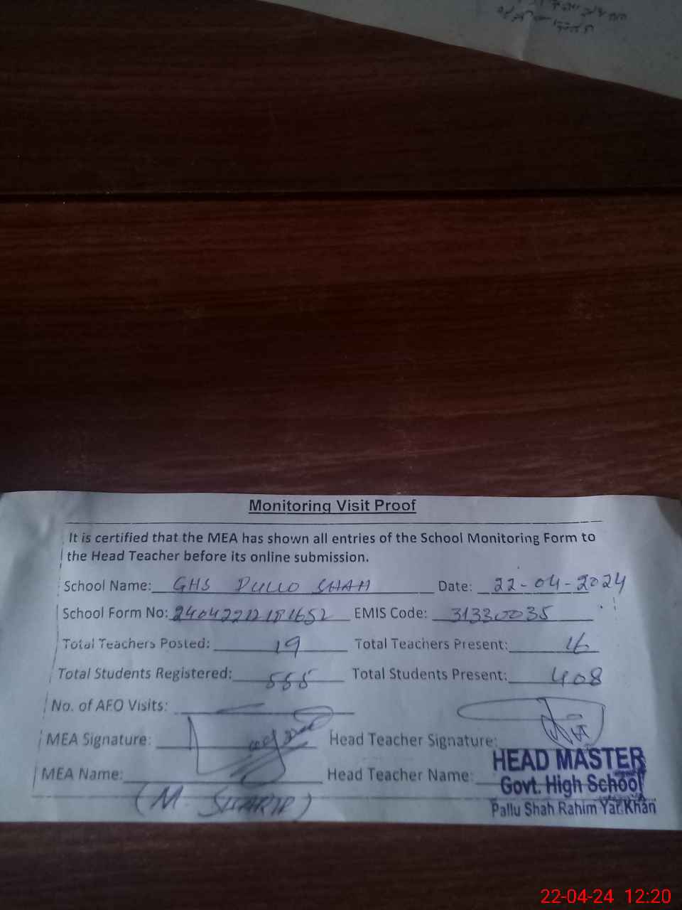 | Attendance Register | Head Teacher | MEA with School | Visit Proof |