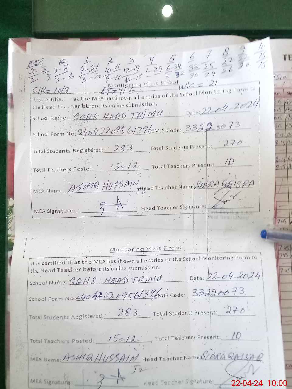| Attendance Register | Head Teacher | MEA with School | Visit Proof |
