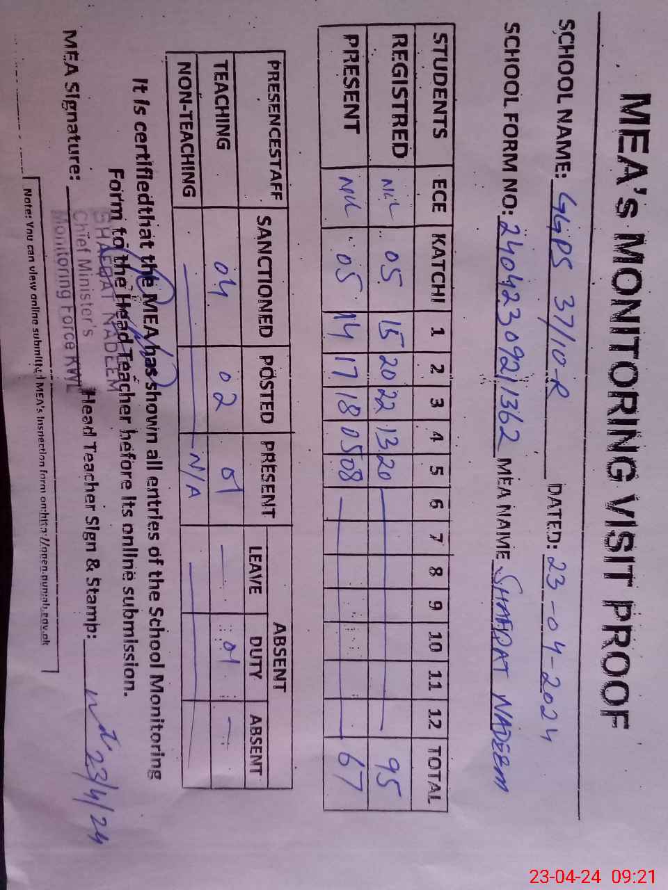 | Attendance Register | Head Teacher | MEA with School | Visit Proof |