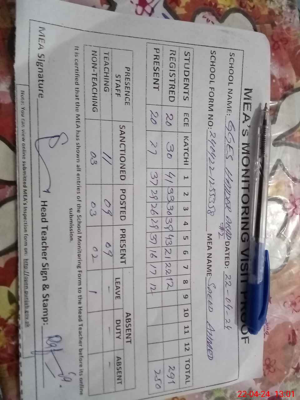 | Certified that this School was Inspected by the Undersigned MEA/DMO Today and the Information Stated Above is as Per Record. | |||||