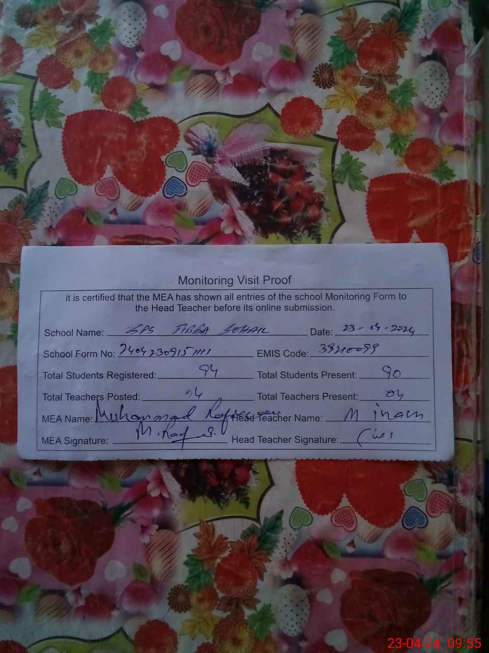 | Attendance Register | Head Teacher | MEA with School | Visit Proof |