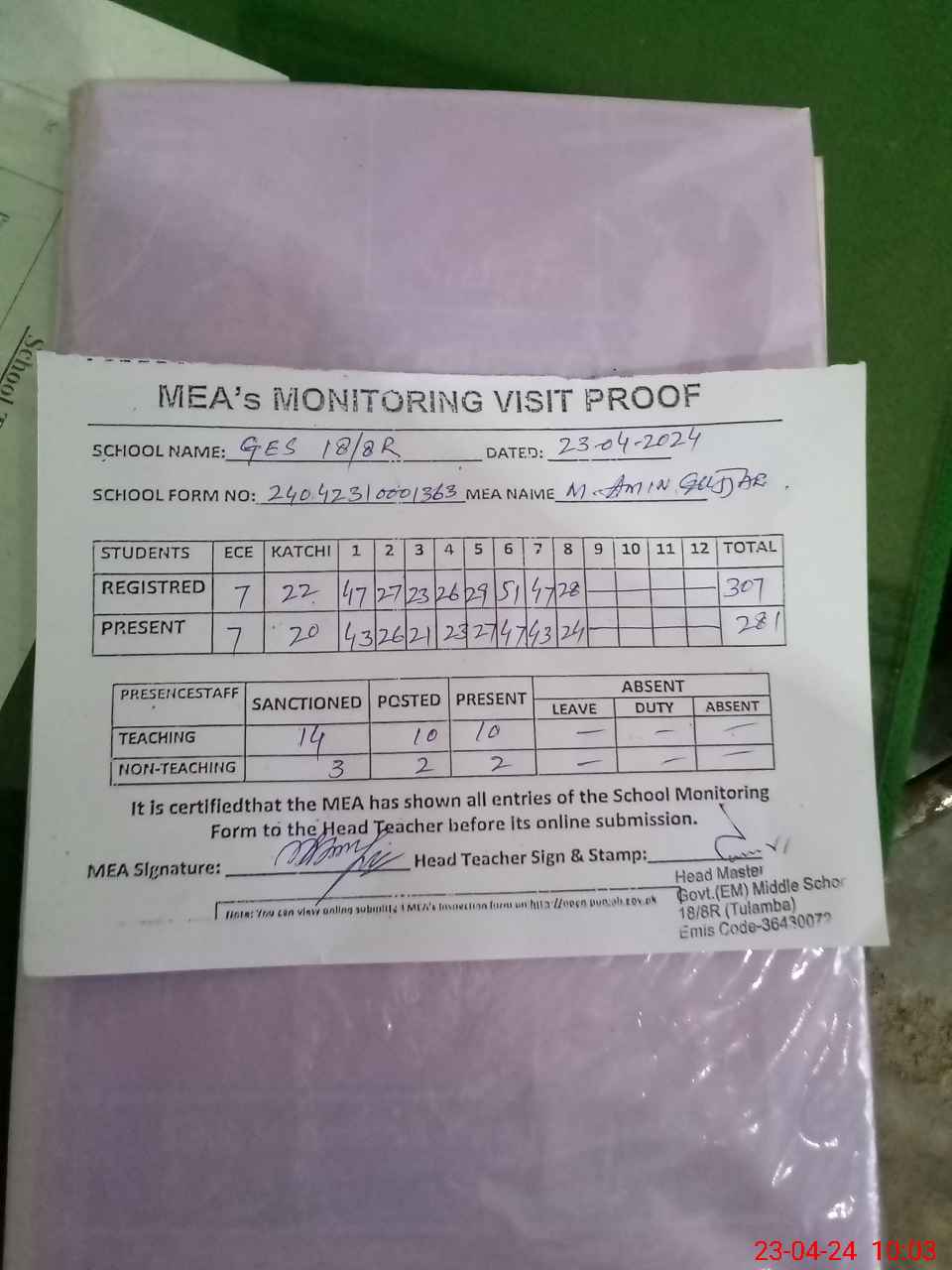 | Attendance Register | Head Teacher | MEA with School | Visit Proof |