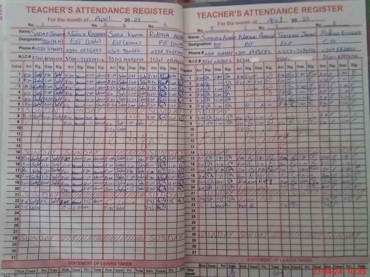 | CNIC | Full Name | Designation | R/C | Absence During Last Calender Month |