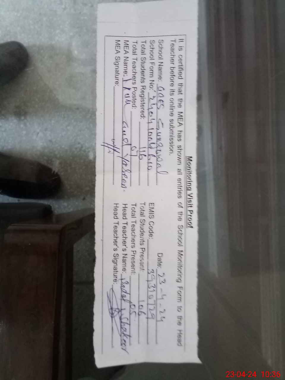 | Attendance Register | Head Teacher | MEA with School | Visit Proof |