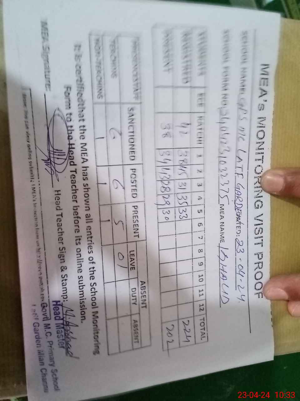 | Attendance Register | Head Teacher | MEA with School | Visit Proof |