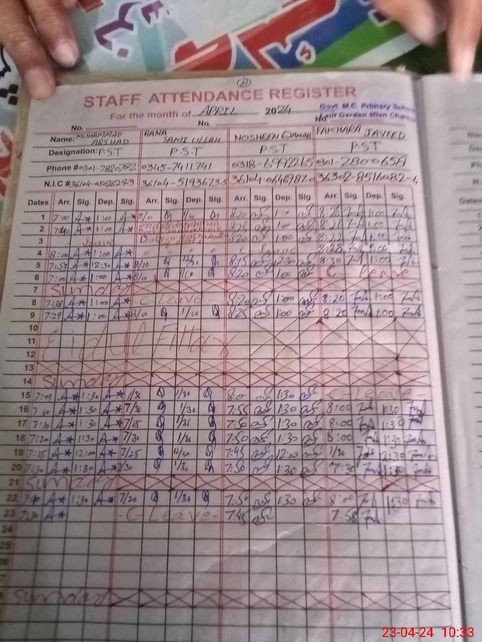 | Name: M.As**** Designation: (School Headmaster's/Headmistress's) PST Phone/Cell Number: 03**** |
