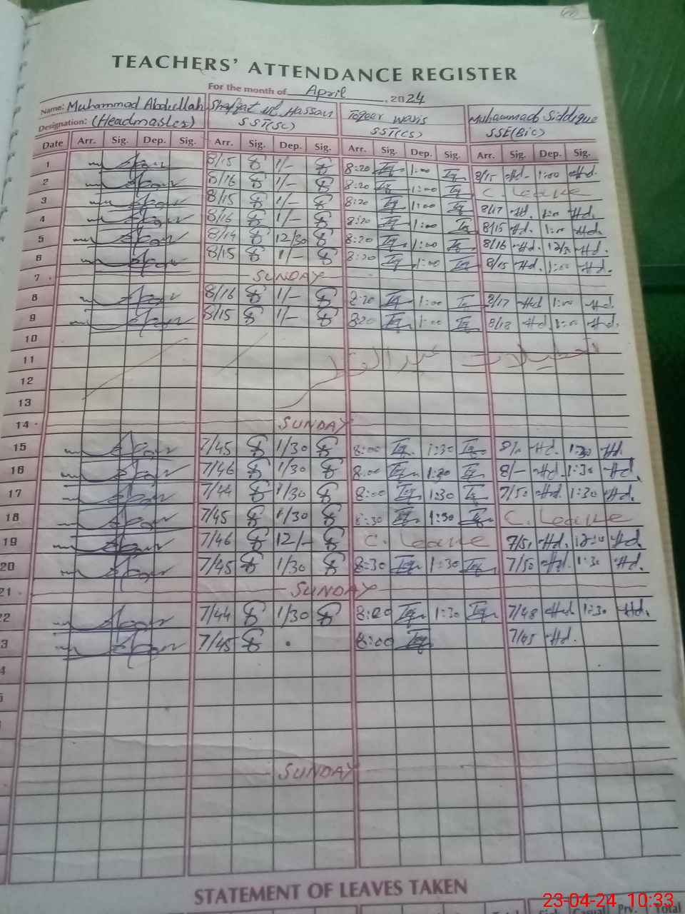 | CNIC | Full Name | Designation | R/C | Absence During Last Calender Month |
