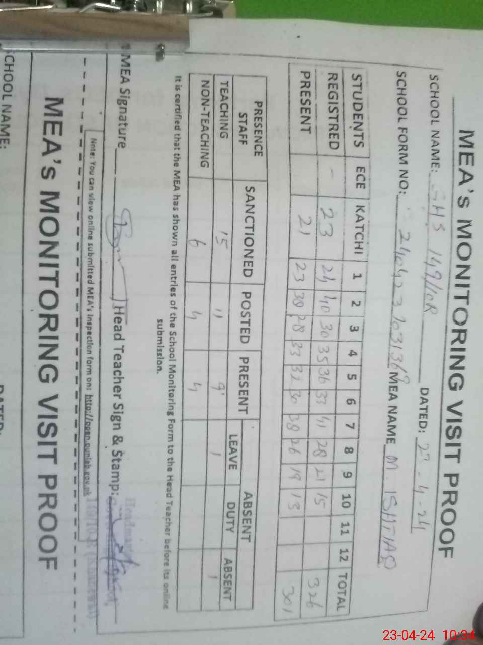 | Attendance Register | Head Teacher | MEA with School | Visit Proof |
