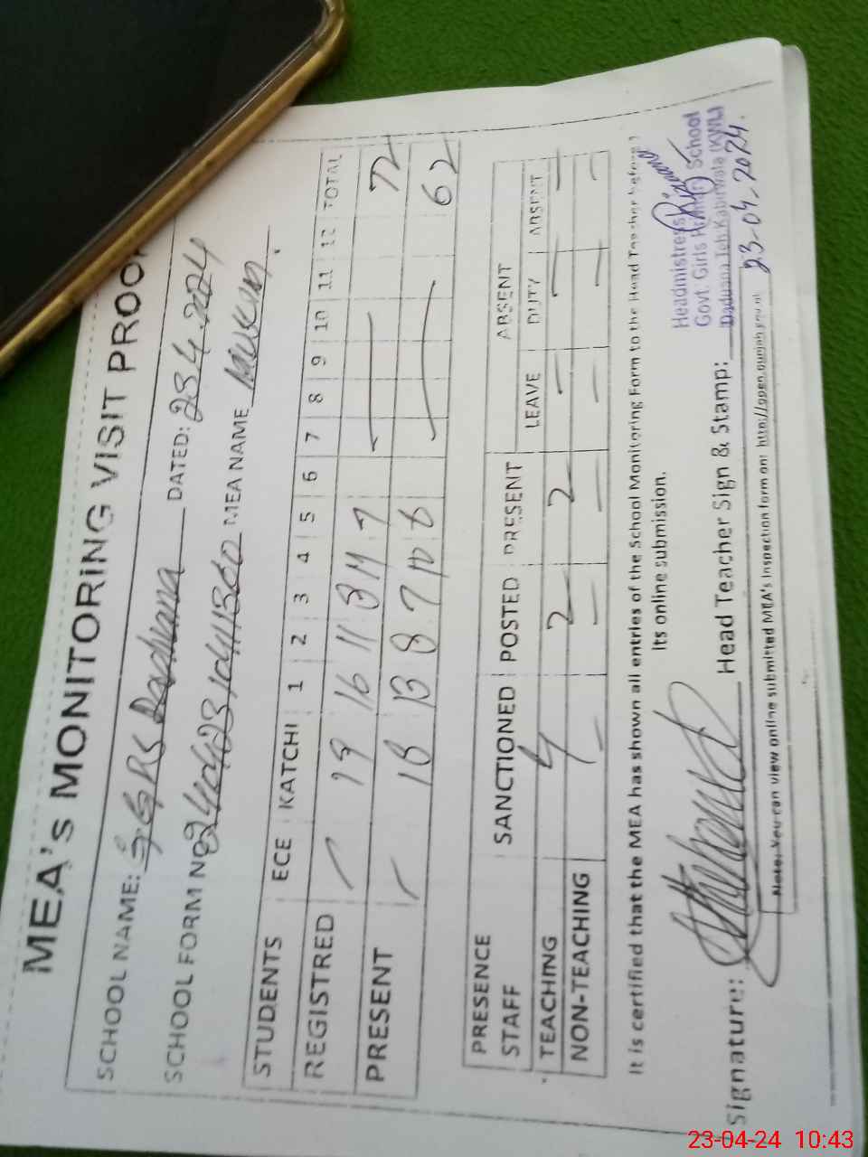 | Attendance Register | Head Teacher | MEA with School | Visit Proof |