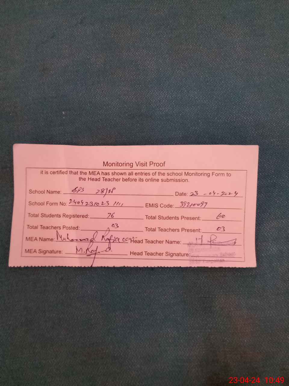 | Attendance Register | Head Teacher | MEA with School | Visit Proof |
