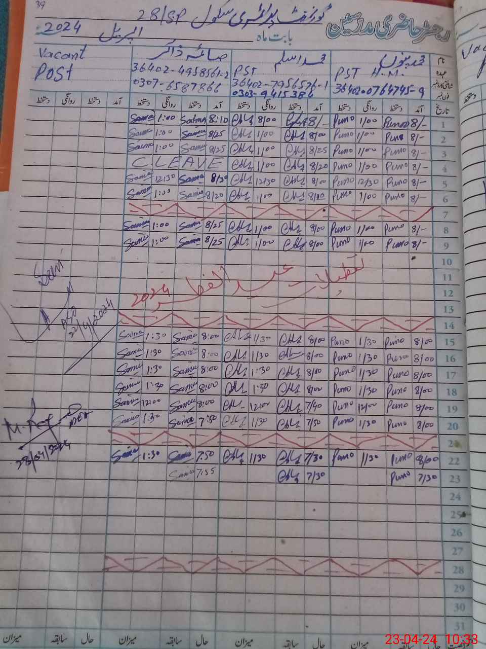 | Name: MU**** PU**** Designation: (School Headmaster's/Headmistress's) PST Phone/Cell Number: 03**** |