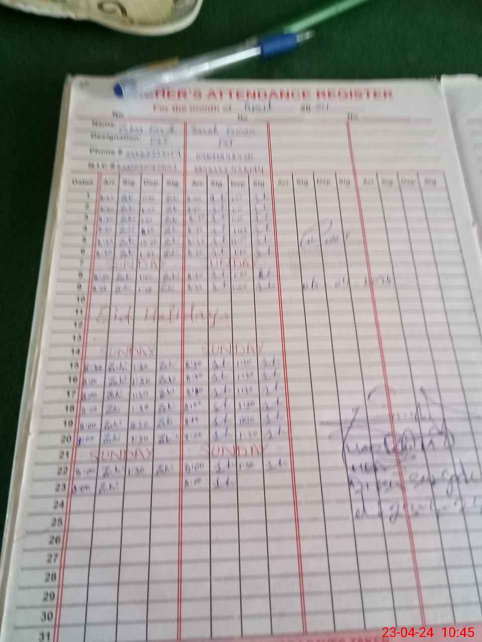 | CNIC | Full Name | Designation | R/C | Absence During Last Calender Month |