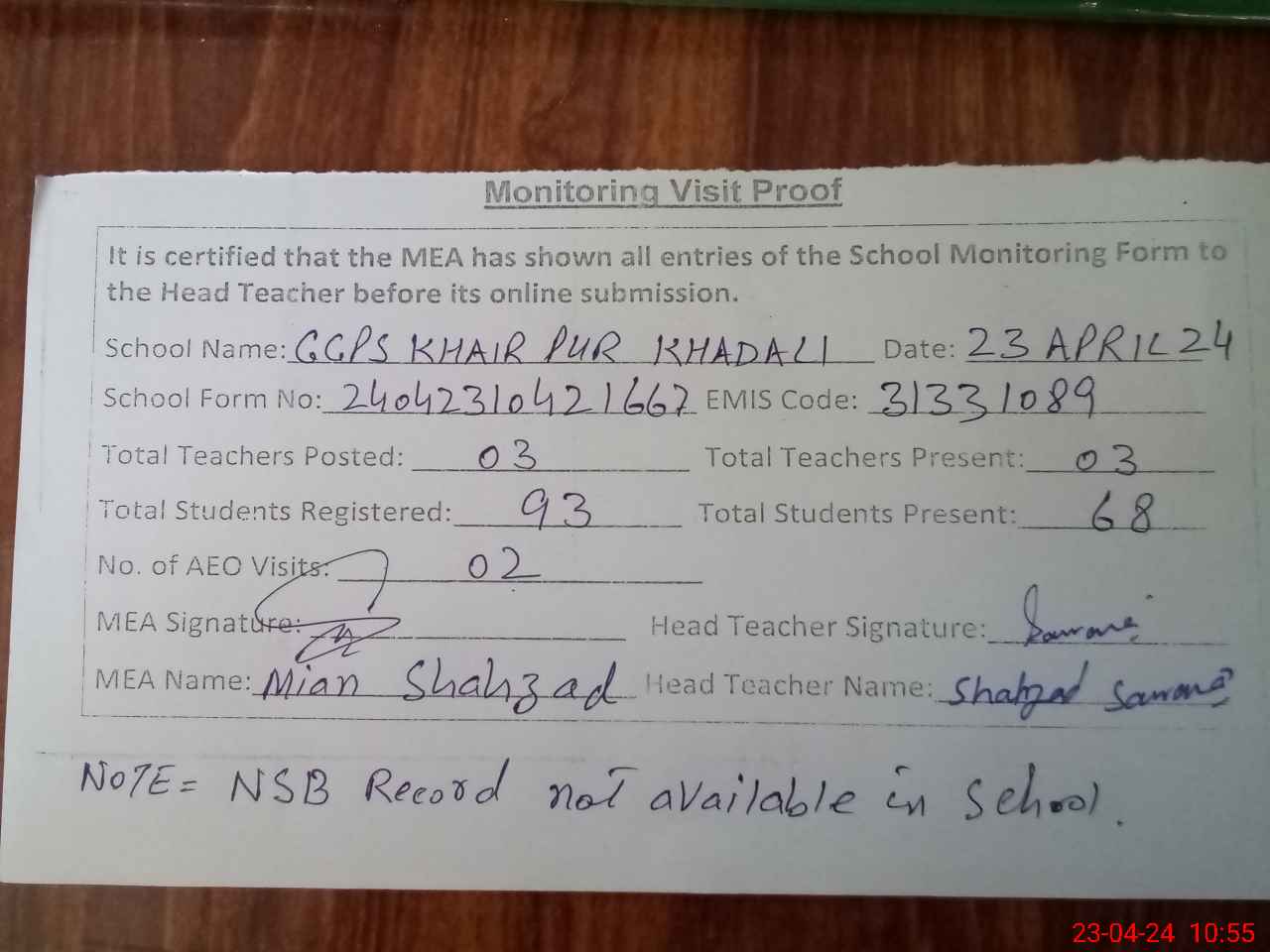 | Remarks (Use Separate Page if Required): During school visit NSB record register or record not available | |||||