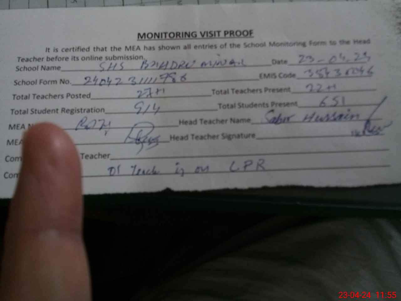 | Attendance Register | Head Teacher | MEA with School | Visit Proof |