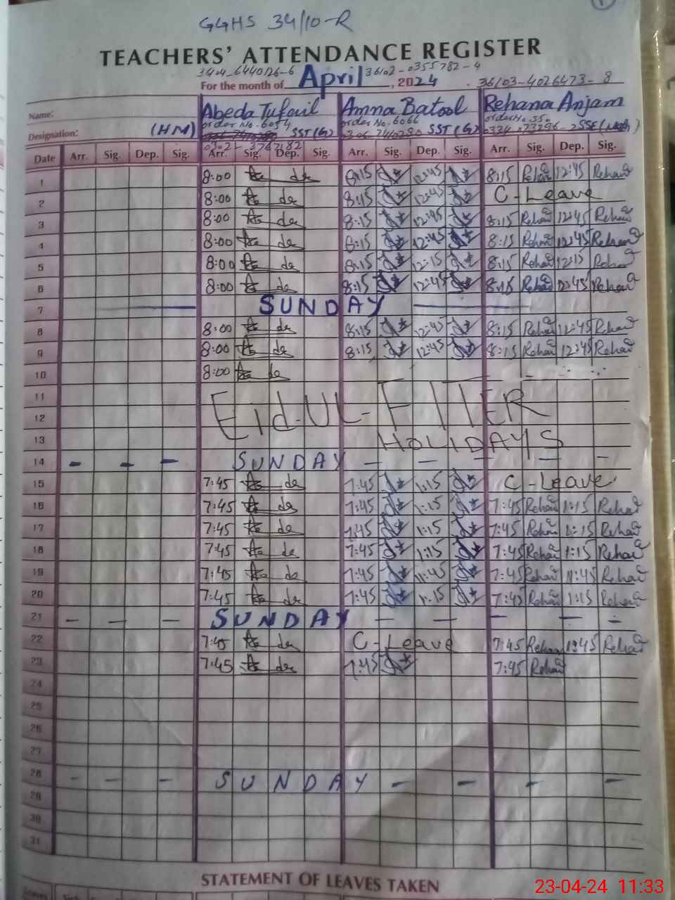 | CNIC | Full Name | Designation | R/C | Absence During Last Calender Month |