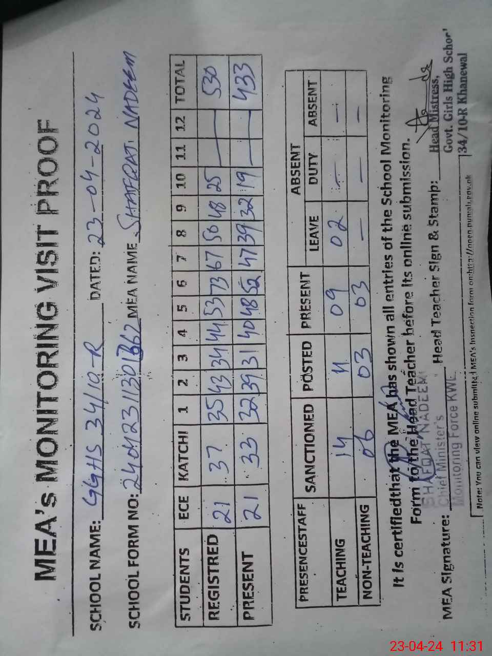 | Attendance Register | Head Teacher | MEA with School | Visit Proof |