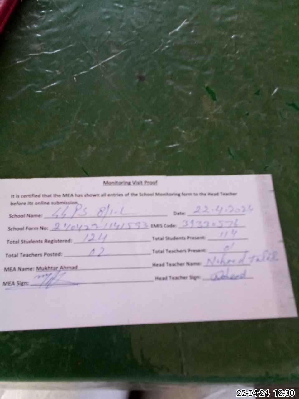 | Attendance Register | Head Teacher | MEA with School | Visit Proof |
