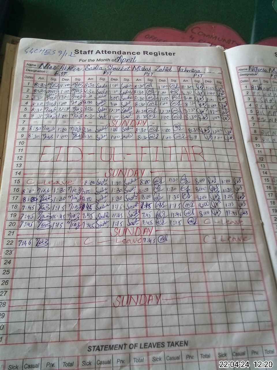 | CNIC | Full Name | Designation | R/C | Absence During Last Calender Month |