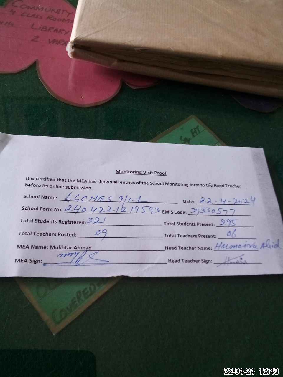 | Attendance Register | Head Teacher | MEA with School | Visit Proof |