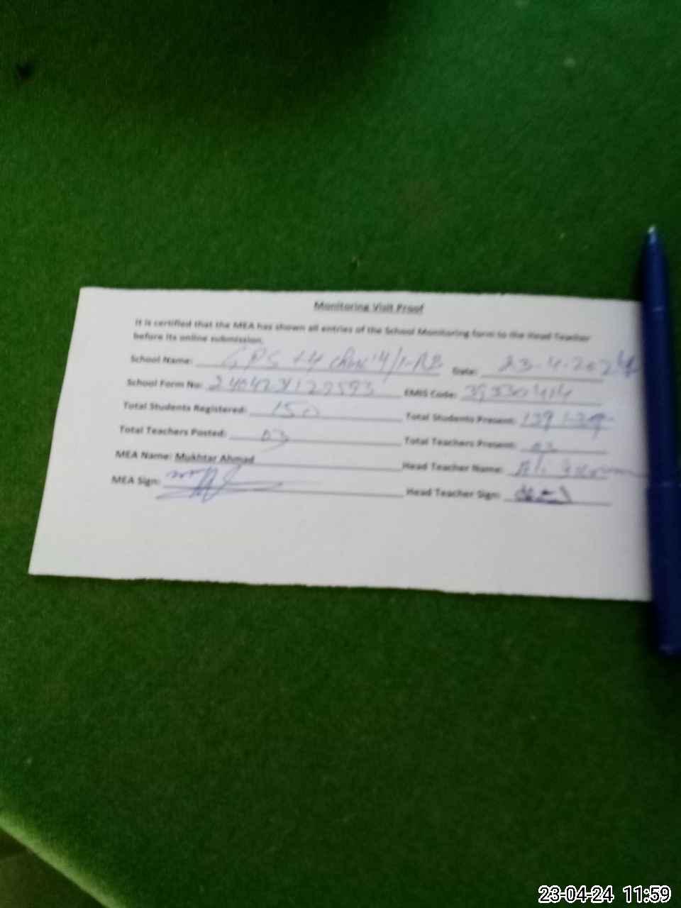 | Attendance Register | Head Teacher | MEA with School | Visit Proof |