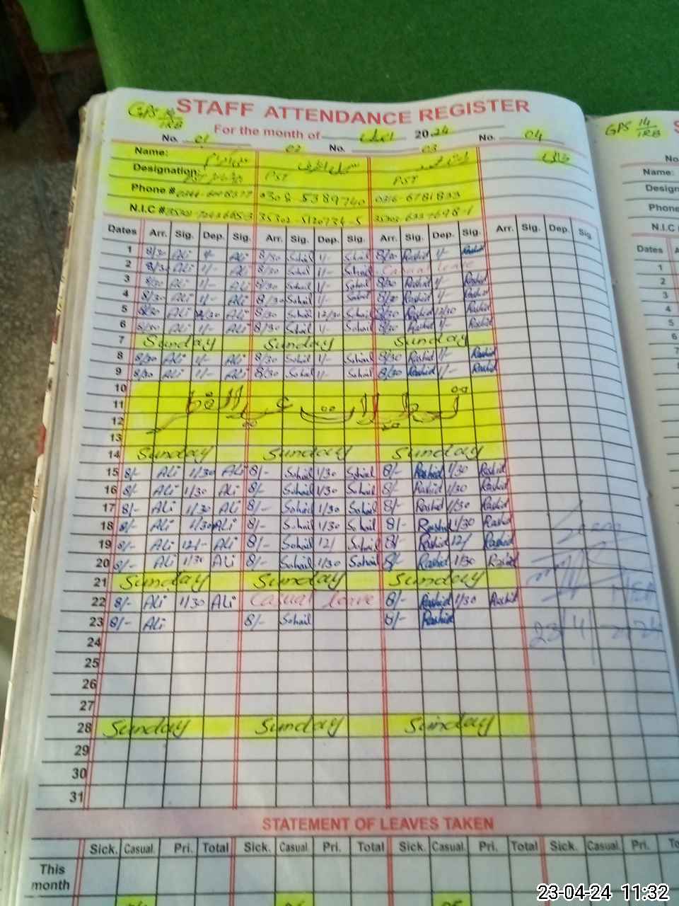 | CNIC | Full Name | Designation | R/C | Absence During Last Calender Month |