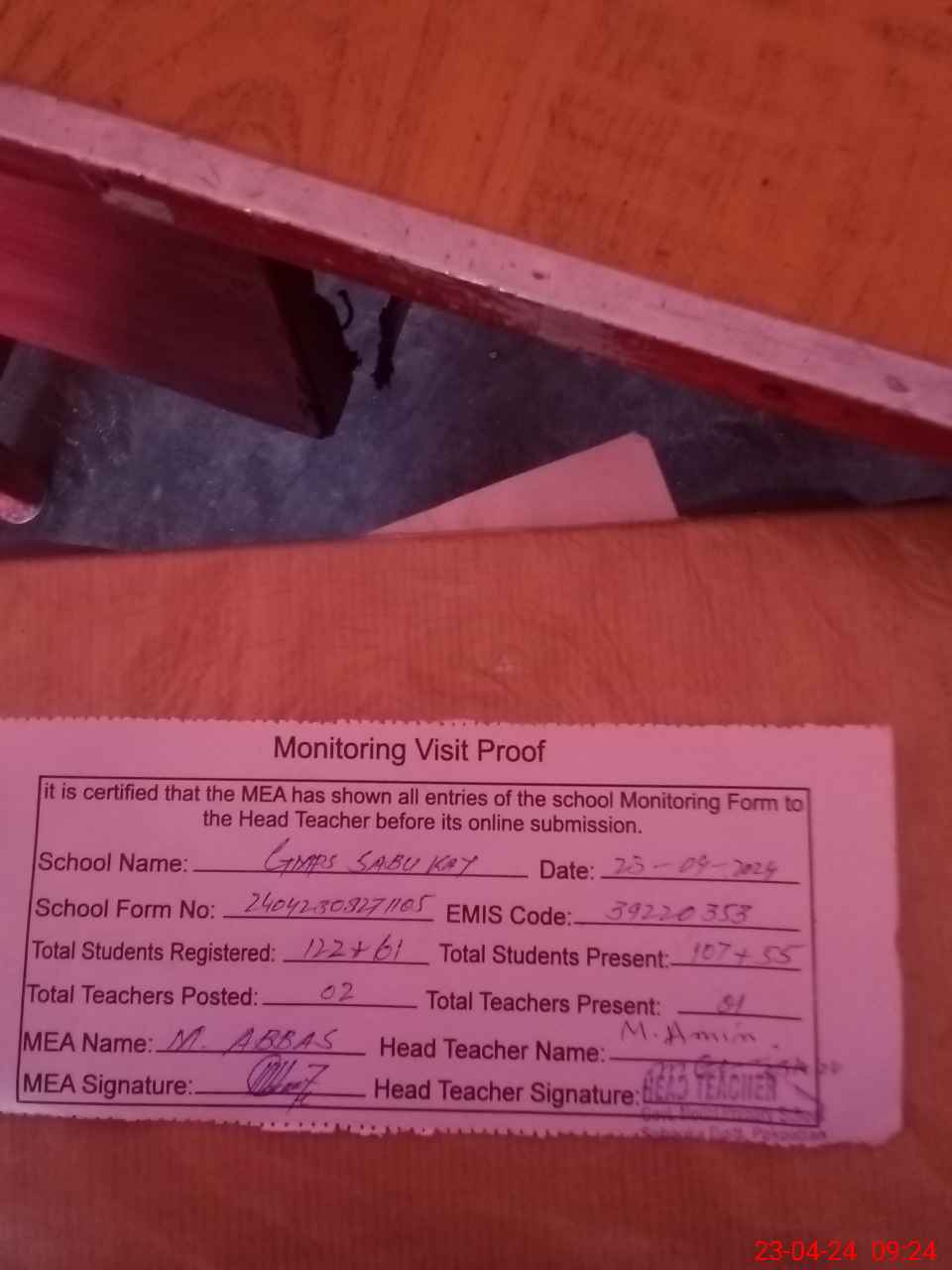 | Attendance Register | Head Teacher | MEA with School | Visit Proof |