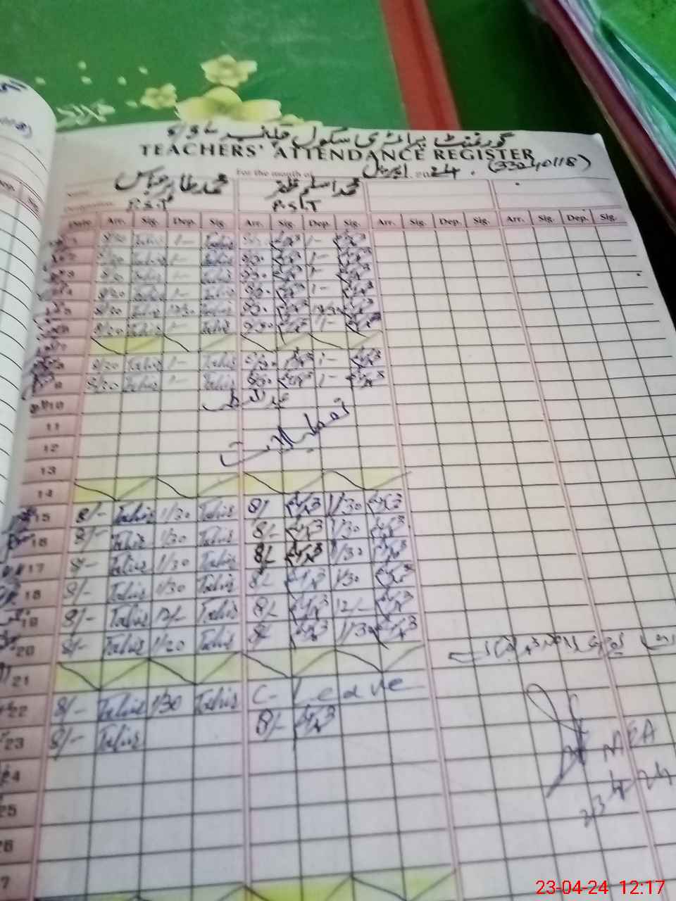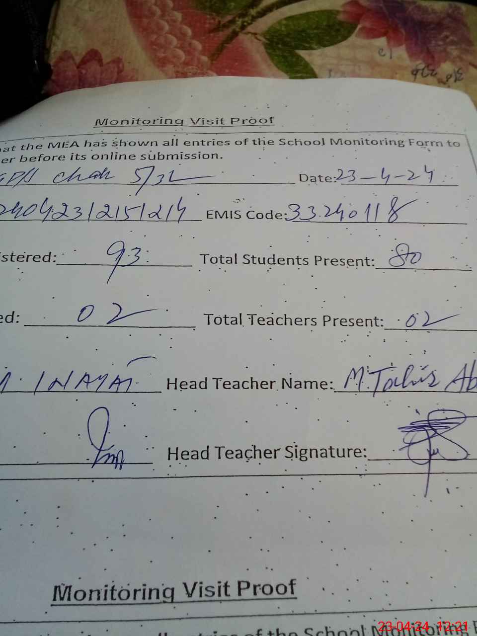 | Attendance Register | Head Teacher | MEA with School | Visit Proof |