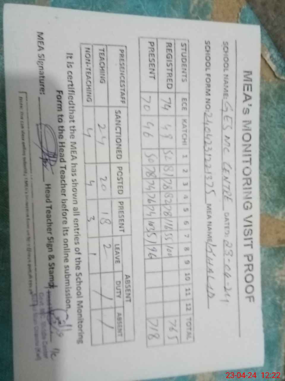 | Attendance Register | Head Teacher | MEA with School | Visit Proof |