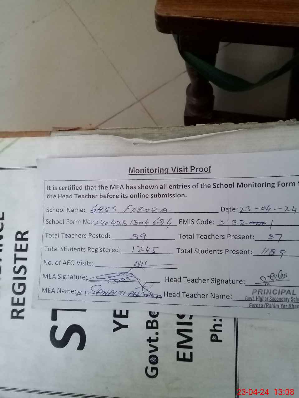 | Attendance Register | Head Teacher | MEA with School | Visit Proof |