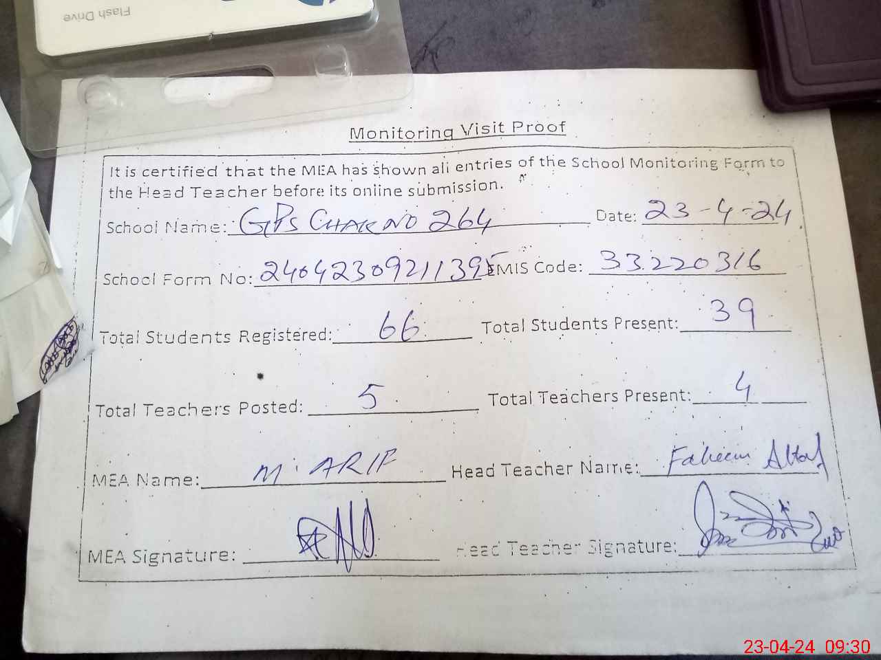 | Attendance Register | Head Teacher | MEA with School | Visit Proof |