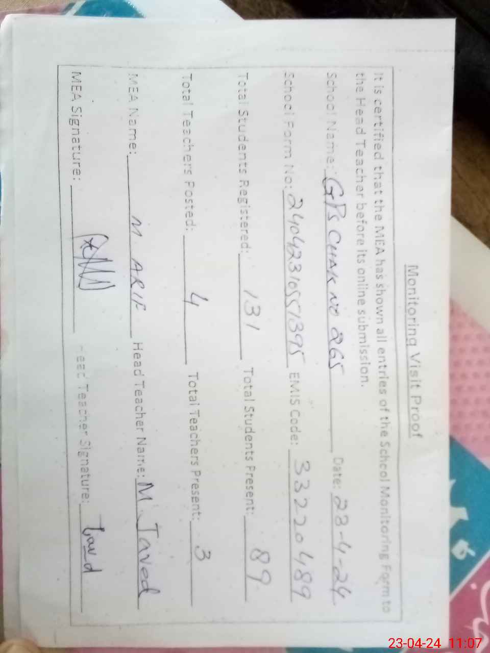 | EMIS Code: 33220489 | Name of School: GPS CHAK NO 265 JB | |||