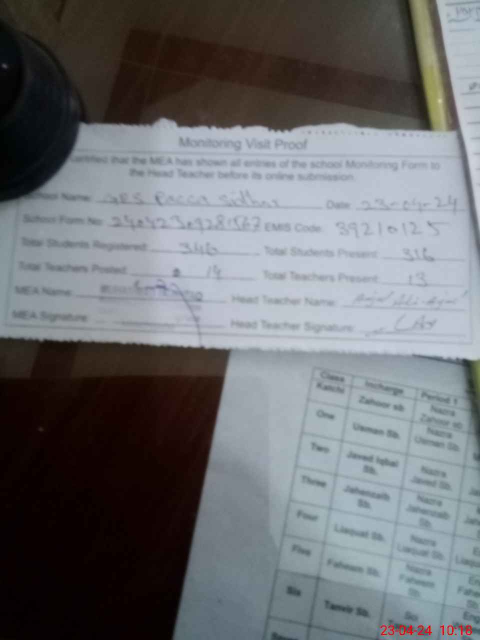 | Attendance Register | Head Teacher | MEA with School | Visit Proof |