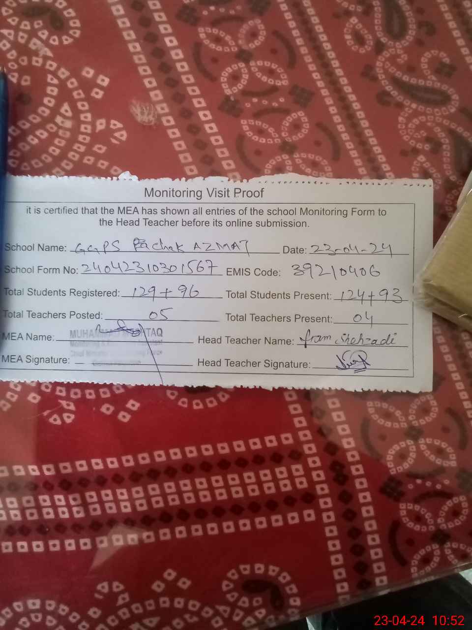 | Attendance Register | Head Teacher | MEA with School | Visit Proof |