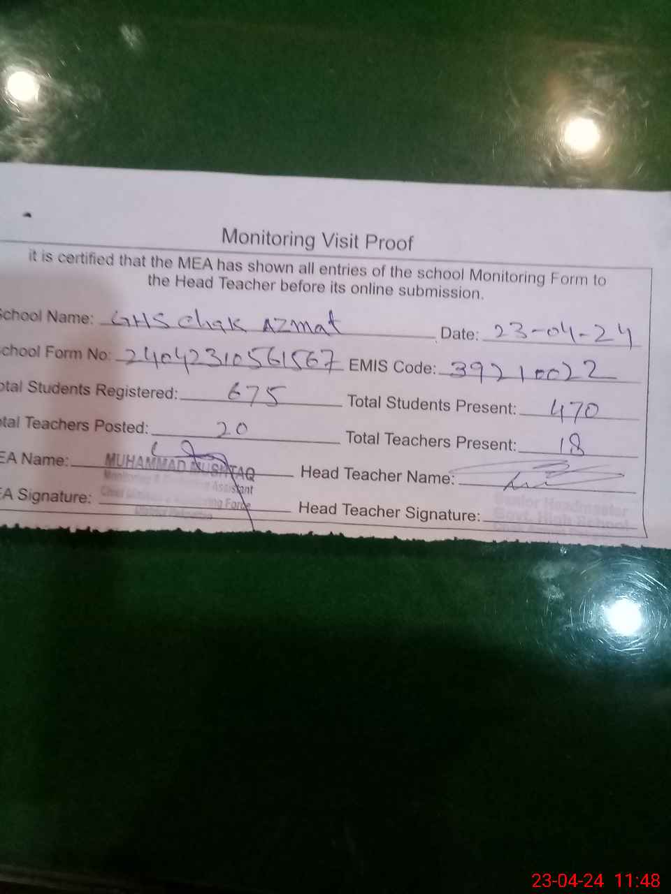 | EMIS Code: 39210022 | Name of School: GHS CHAK AZMAT | |||