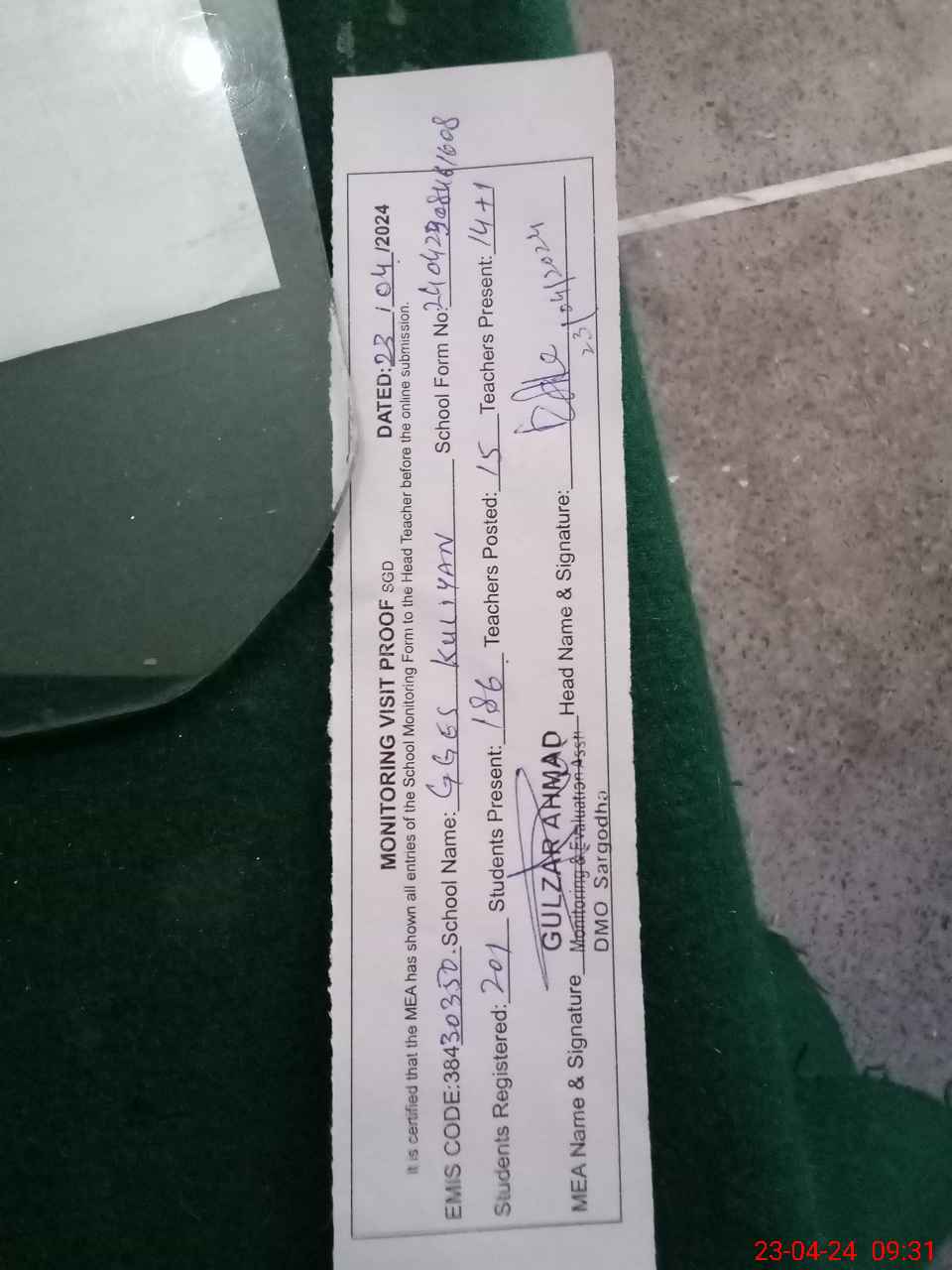 | Attendance Register | Head Teacher | MEA with School | Visit Proof |