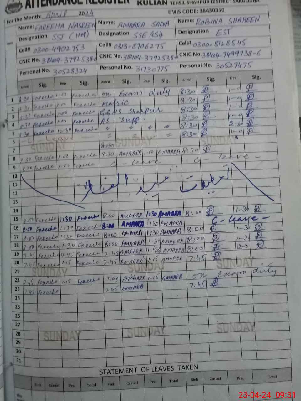 | 38**** | Sy**** Na**** Ba**** | 3 | 1 | 0 | 0 | 0 | 0 | 0 | 0 | 0 | 0 | 0 | Exam Duty |