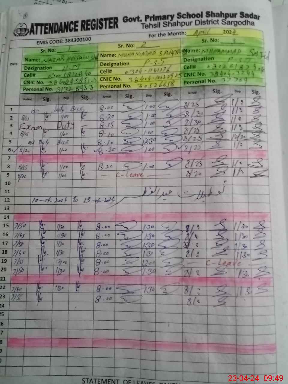 | CNIC | Full Name | Designation | R/C | Absence During Last Calender Month |