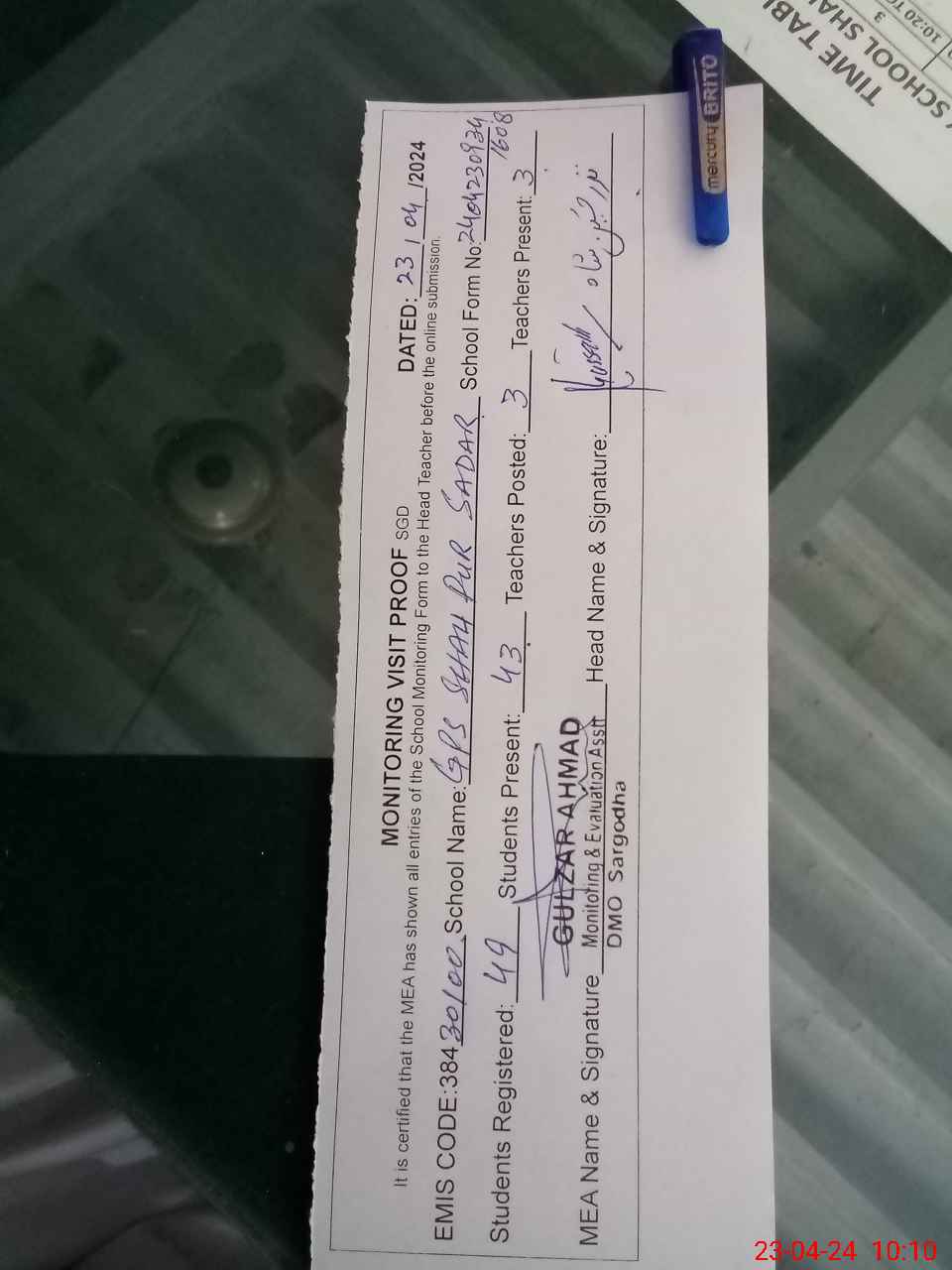 | Attendance Register | Head Teacher | MEA with School | Visit Proof |
