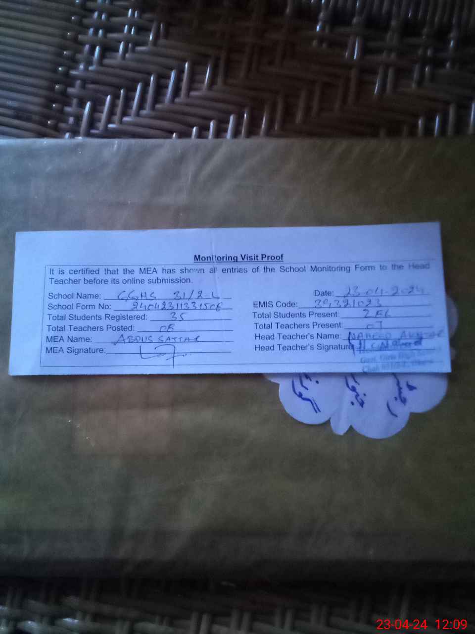 | Attendance Register | Head Teacher | MEA with School | Visit Proof |